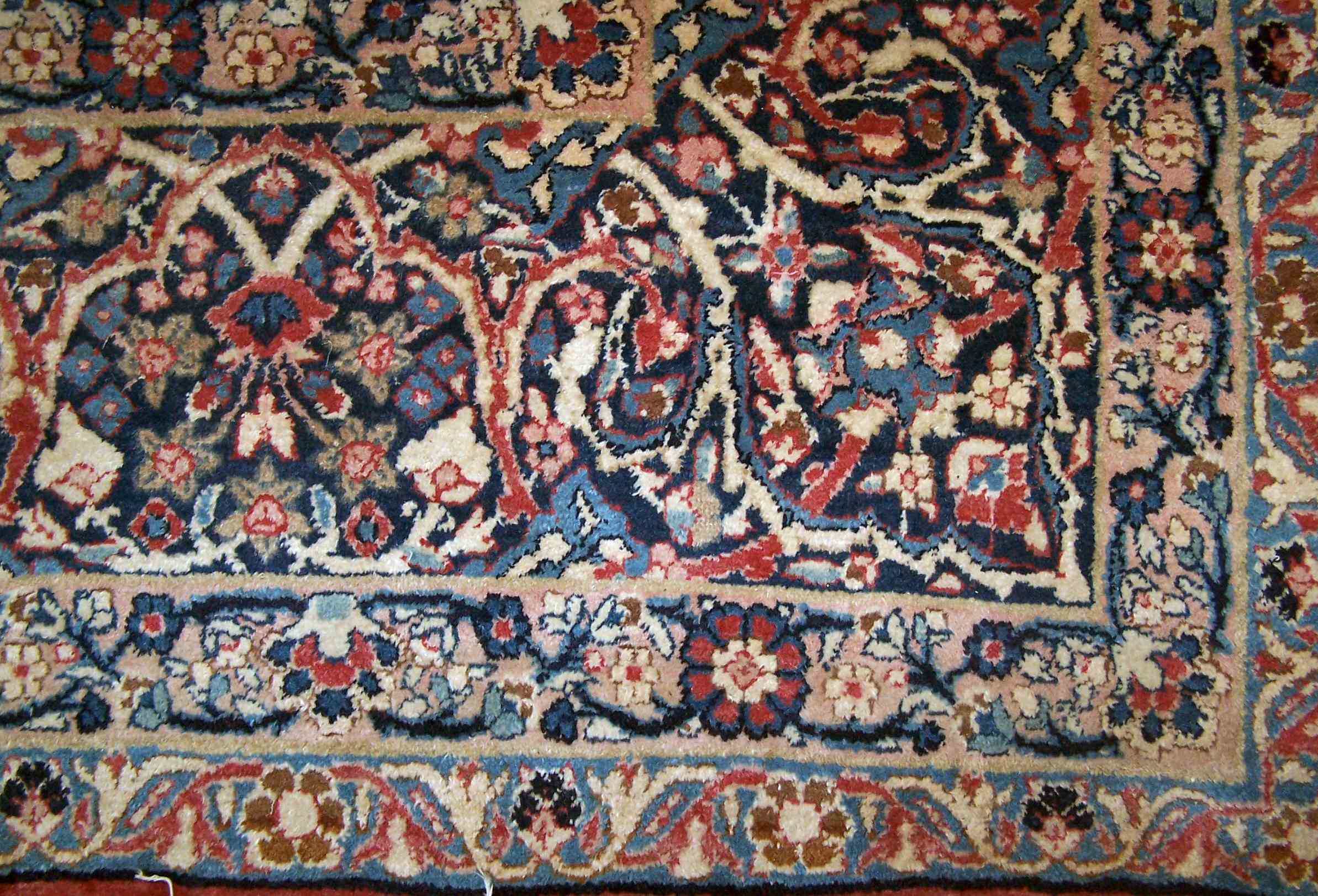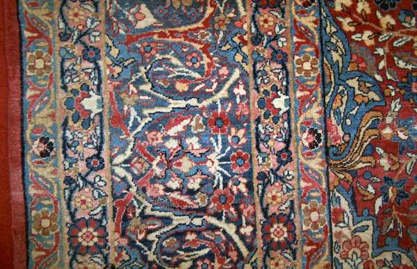 the crimson and blue field with cusped floral medallion and pendants between conforming spandrels and main palmette border between double floral meanders