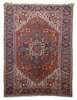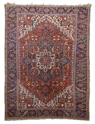 the red field with central indigo and ivory medallion suspending pendants, ivory and red spandrels, within indigo rosette and leafy vine border between blue, red and yellow bands