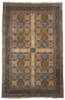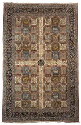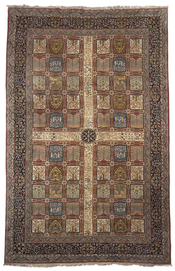 possibly Eastern European, the cruciform field with central foliate roundel and fifteen rectangular tree and vase panels to each quarter, within indigo scrolling floral vine border between palmette bands