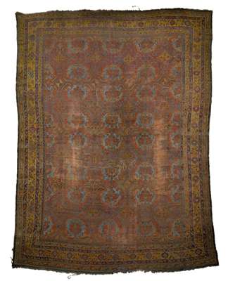 the red field with allover pattern of large light blue palmettes and cruciform motifs, within ochre rosette and diagonal vine border between bands (worn)