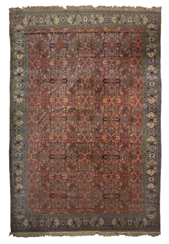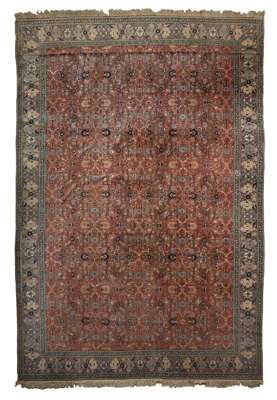 the rose red field with allover pattern of palmettes, flowers, vine and strapwork, within cafe-au-lait cartouche and floral vine border between green bands