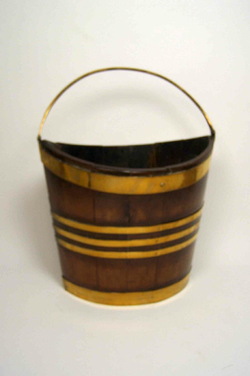 of navette form, the coopered sides upswept to a slender brass swing handle with heart-shaped mounts