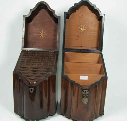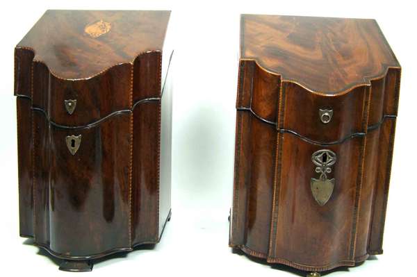 Two similar George III mahogany serpentine fronted cutlery boxes