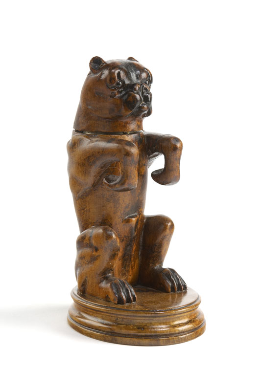 A late 19th century carved walnut pug dog inkwell