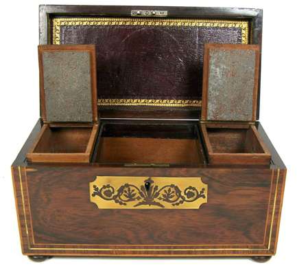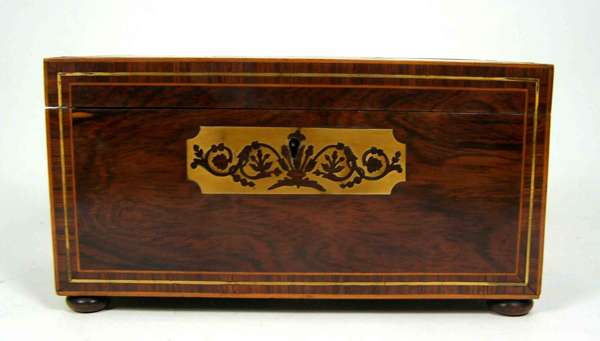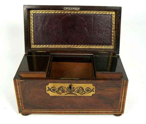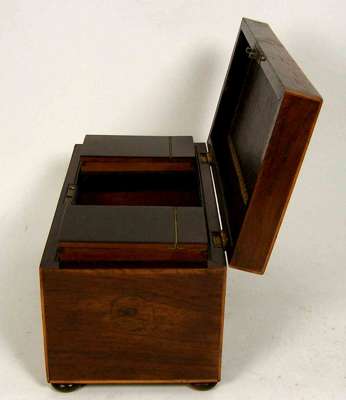 the hinged lid and sides with kingwood banding, opening to reveal a fitted interior, raised on squat bun feet