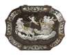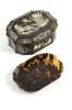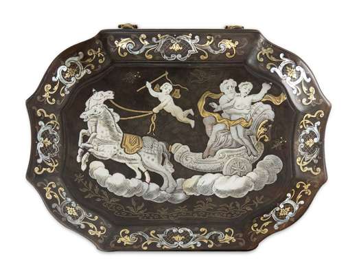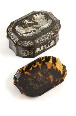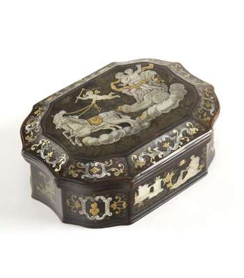 Of shaped oblong form, the hinged lid inlaid with a mythological scene, opening to reveal an interior with removable tray, the sides decorated with classical maidens, castles, cartouche shaped portrait bust and foliage