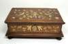 the hinged lid and sides inlaid with a cherub, exotic birds, insects and scrolling foliage, opening to reveal a void interior, raised on turned bun feet