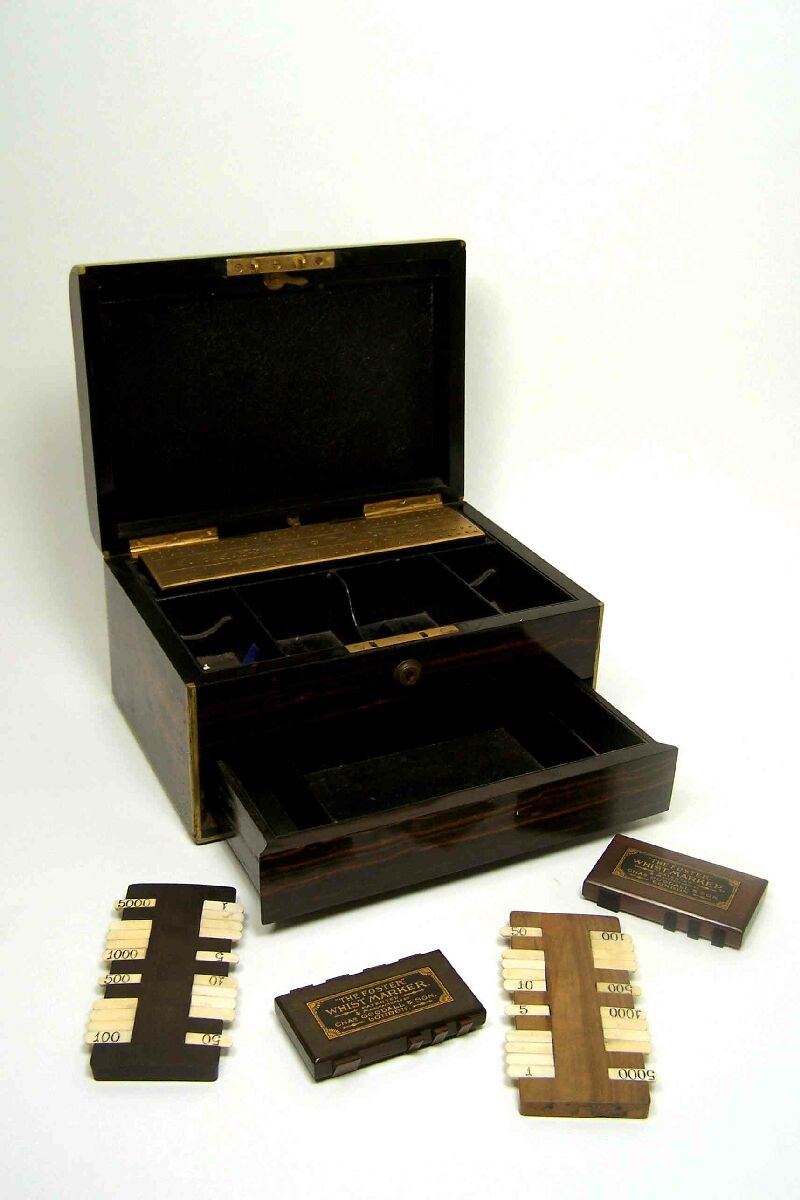 the brass bound sides with a hinged lid and apron drawer, opening to reveal a compartmented interior with games boards