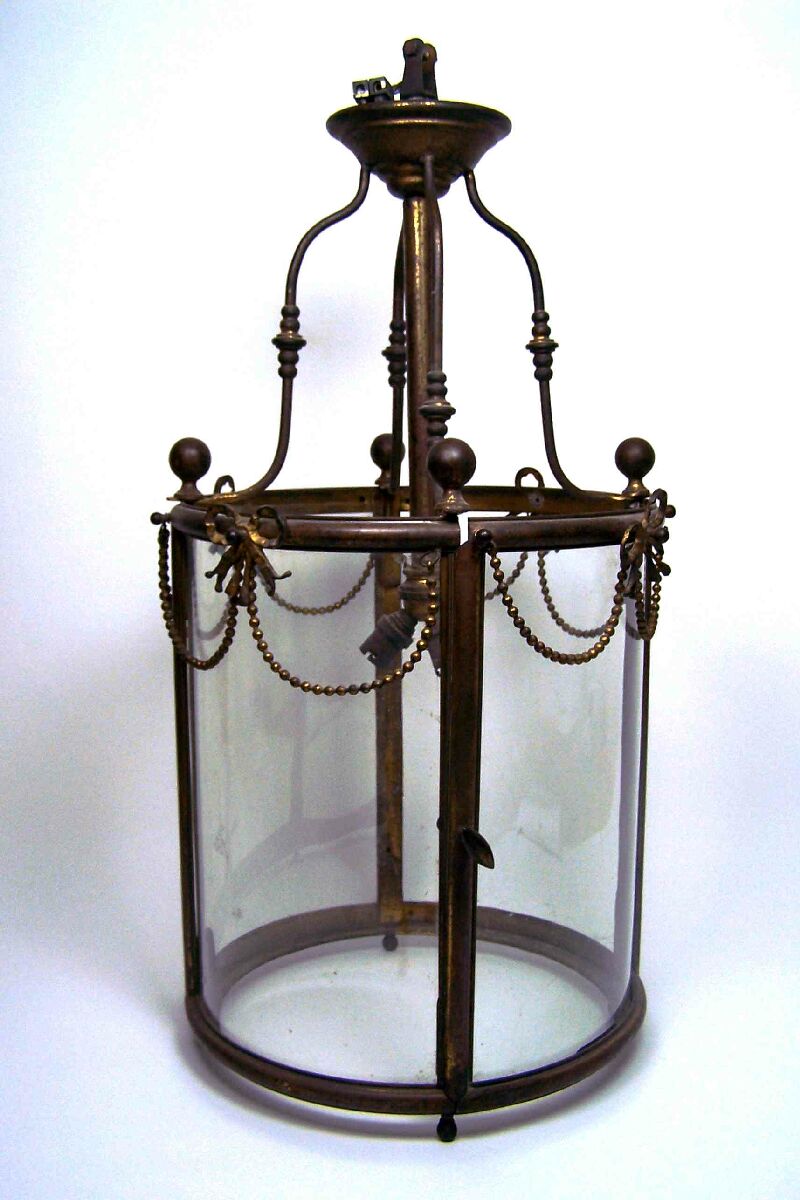 of cylindrical design with a frieze of ribbon-tied beaded swags, suspended on four scrolling supports to a central boss
