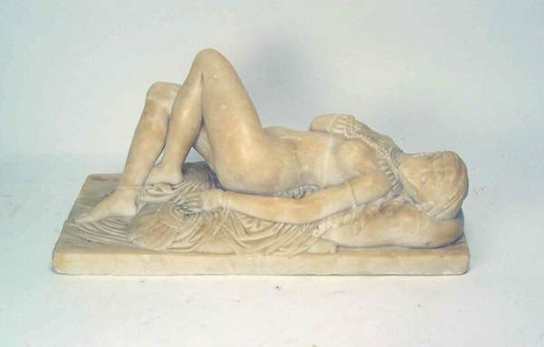 the naked girl with knees raised, wearing a turban and holding a long bead necklace, the base carved with cushions, drapery and an ostrich feather fan, the frieze with projecting egg and dart moulded edge, on boldly carved paw feet