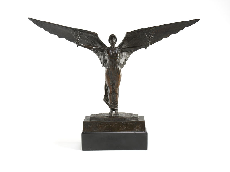 modelled as an angel with outstretched wings standing on a rectangular plinth base, dated 1914-1918, signed with monogram, inscribed, Alex Rudier, Fondeur Paris