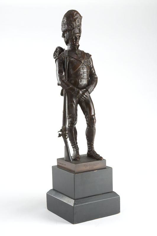 the standing figure in full regalia, holding his long rifle in his right arm, inscribed 'GRENADIER, 1st GUARDS 1815', signed by the sculpter and with Elkington & Co, foundry stamp, raised on an ebonized square