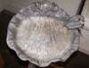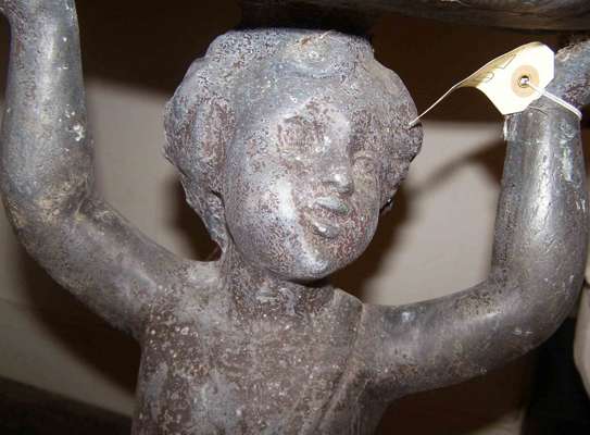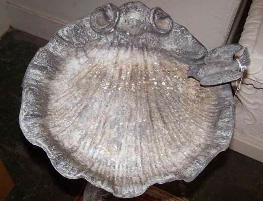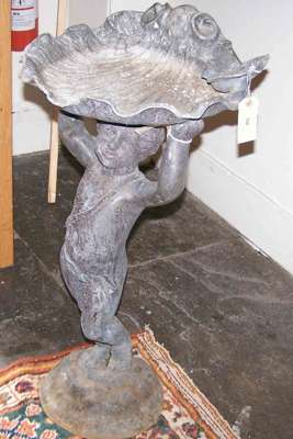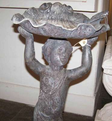 of a putto holding aloft a scallop shell bird bath with perched bird, on domed foot