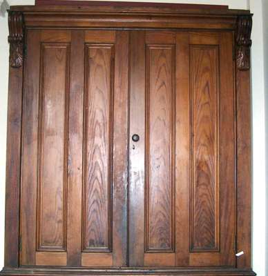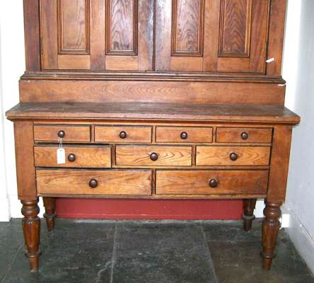 the moulded cornice above two long panelled doors with leaf carved corbels above a rectangular top with stencilled lines, the front enclosing an arrangement of nine short graduated drawers with ebonised cockbeads, on lappet carved tapering legs
