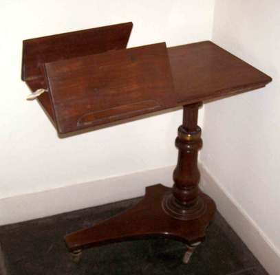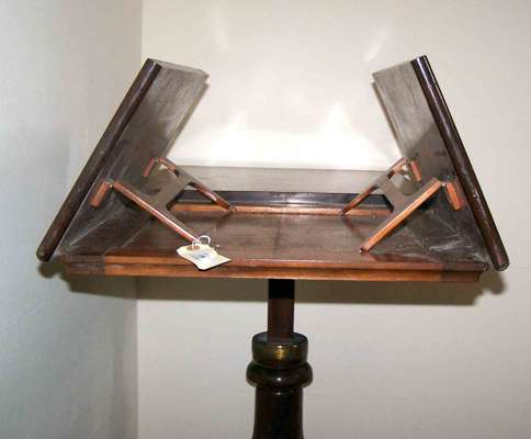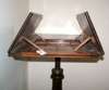 the rectangular top with ratchet book slopes with fitted rests, on a turned column and shaped base with brass socket castors