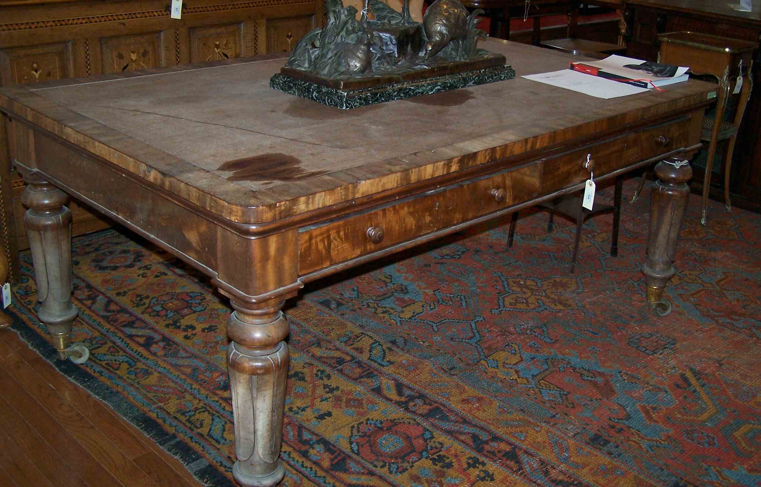 the rounded rectangular top with moulded edge and formerly with skiver above two frieze drawers to either side, on turned and lappet carved legs ending in brass socket castors
