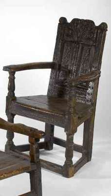 the back with scroll carved cresting above a fleur de lys emblem flanked by rosettes, the fielded panels with strapwork between stiff leaf uprights, the outswept arms on baluster supports above a solid triform seat with chip carved rail,on baluster legs united by perimeter stretchers