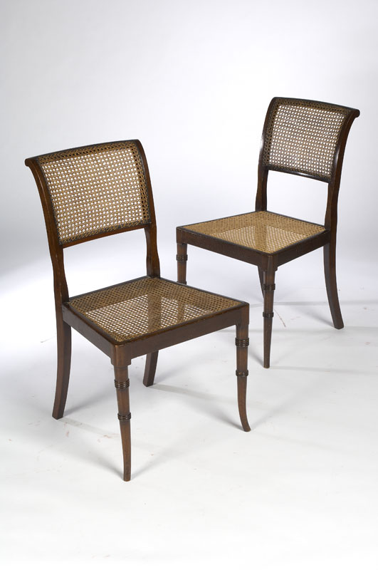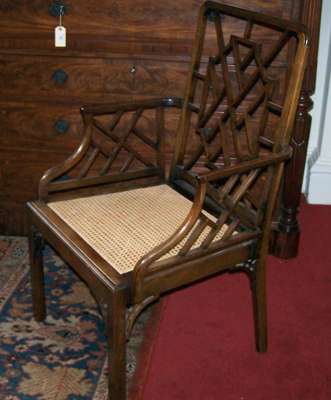 the back and arms composed of a chinoiserie trellis above a drop in split cane seat on square section legs headed by angle frets; together with a pair of 19th century mahogany hand chairs with split cane upholstery, on ring turned and splayed legs (3)