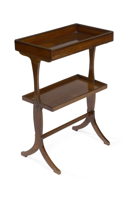 with two graduated tray tops of navette shaped design (the upper one with hinged drop front) on lozenge applied trestle end standards with dual splay feet