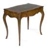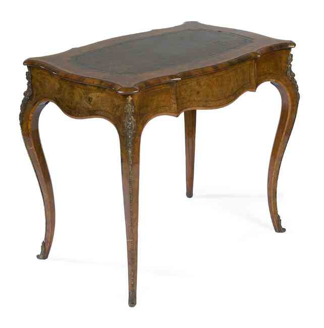 in the Louis XV style, the serpentine shaped top with an inset leather writing surface, over a shaped frieze with one drawer, raised on square cabriole legs decorated with gilt metal mounts