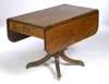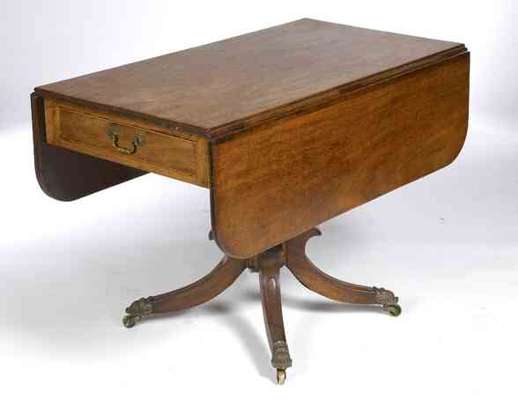 the top with reeded edge above a frieze drawer and opposing blind drawer on baluster column and four hipped and moulded sabre legs ending in brass foliate cast caps and castors