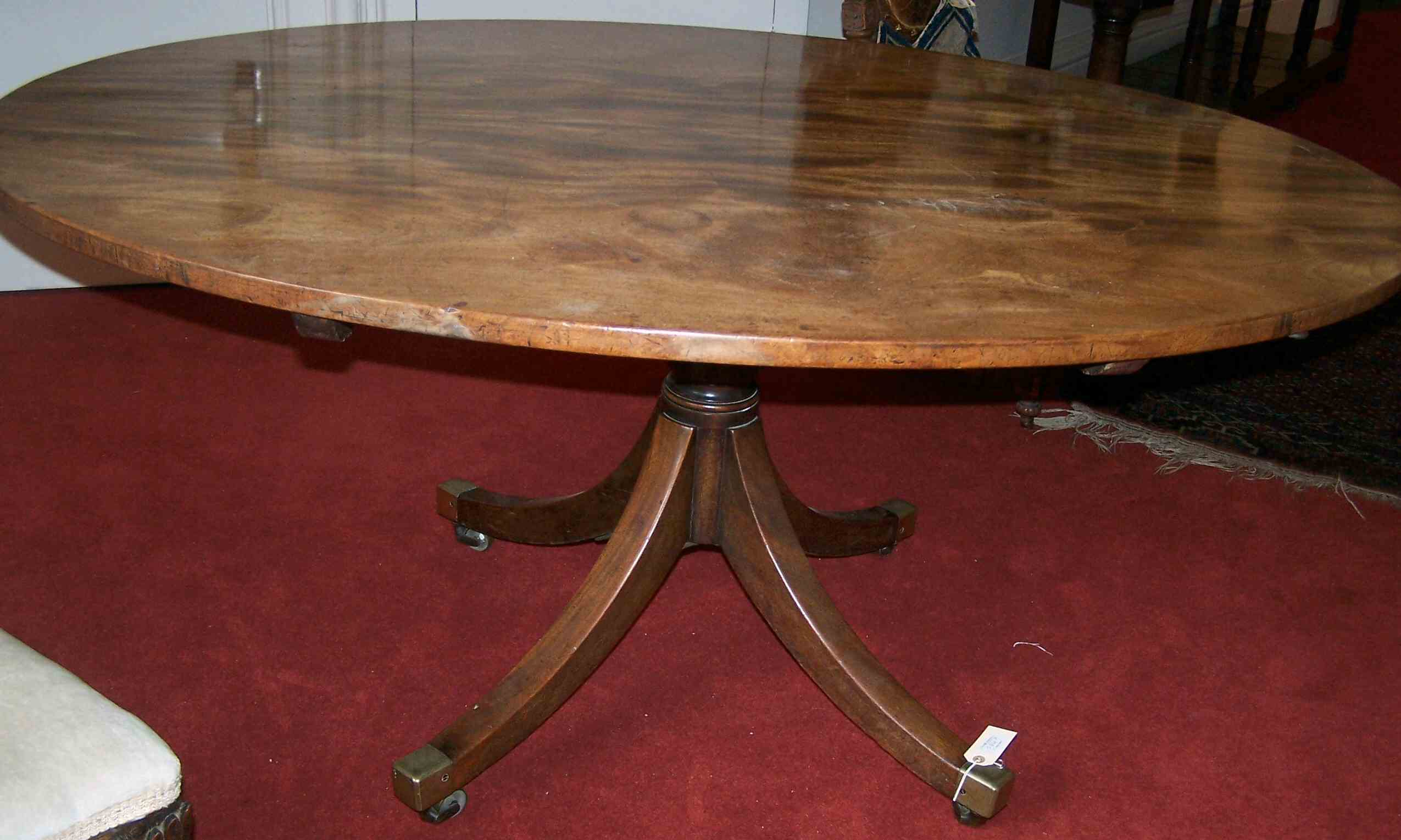 the well-figured top with flat edge and brass swing clips, possibly for retaining extra circumference leaves, on a short tapering column and four downswept sabre legs ending in brass box castors