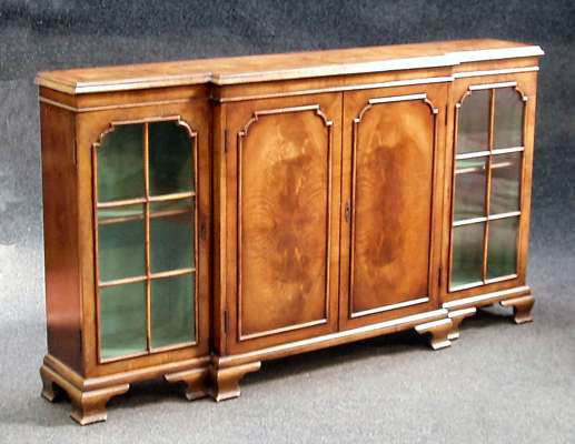 of breakfront form, the top with moulded edge above a moulded frieze and a pair of re-entrant arched cupboard doors, flanking a pair of similarly arched astragal glazed doors enlcosing adjustable shelves, on ogee bracket feet