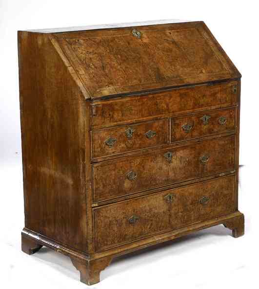 A George I period burr walnut and feather banded bureau