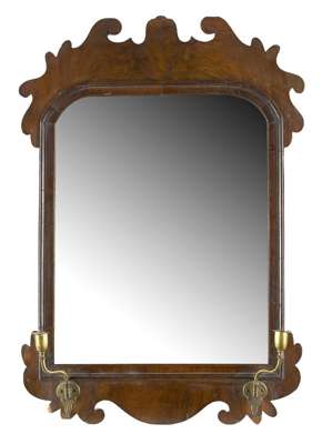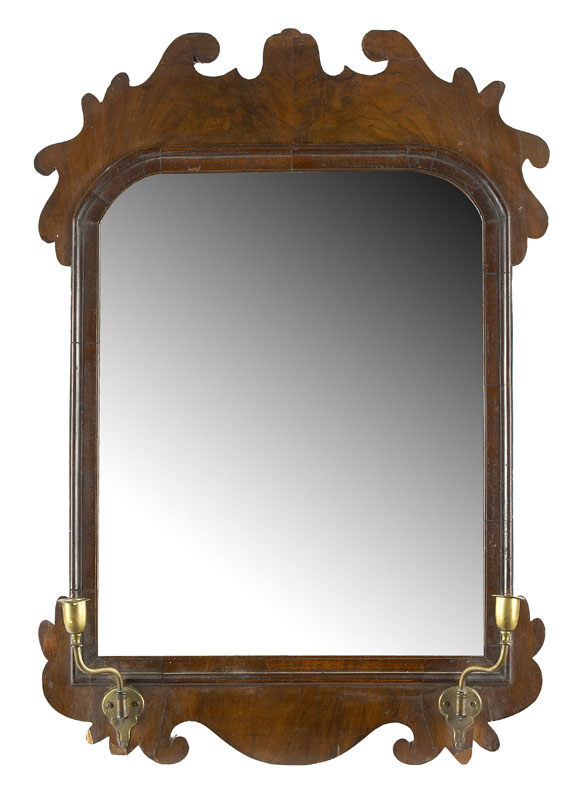 the re-entrant arched and moulded inner slip with scroll-cut cresting and pendant flanked by a pair of brass candle sconces on shaped solid backplates