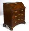 the cleated fall enclosing a fitted interior of drawers and pigeon-holes and two short and two long graduated drawers with brass drop handles, on high ogee bracket feet