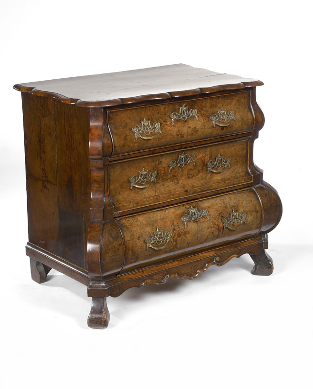 the serpentine moulded top over three long graduated drawers, flanked by outset corners, raised on scroll feet
