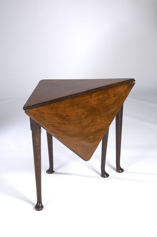 the triangular top with conforming drop leaf above a plain frieze on turned legs ending in pad feet
