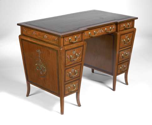 A Sheraton Revival satinwood, crossbanded and floral painted kneehole desk By Edwards & Roberts