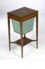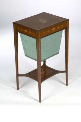 the top decorated with a young lady wearing a bonnet bordered by festoons of roses above a wool drawer, on square tapering legs united by an undershelf