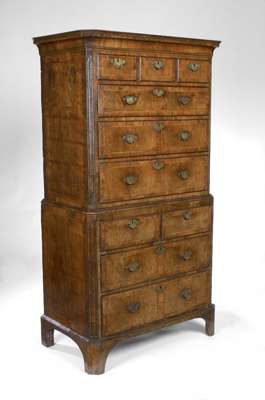 the cavetto moulded cornice over three short and three long graduated drawers, flanked by reeded canted corners, the lower section with three further long graduated drawers, raised on bracket feet
