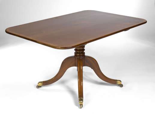 the rounded rectangular tilt top, raised on a turned column support with four downswept legs, terminating in brass cappings and castors
