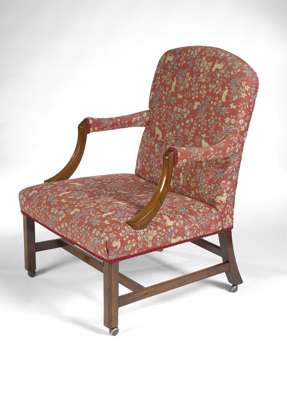 the arched back, padded scroll arms and overstuffed seat covered in foliate pattern pink fabric, raised on square legs united by an H-shaped stretcher