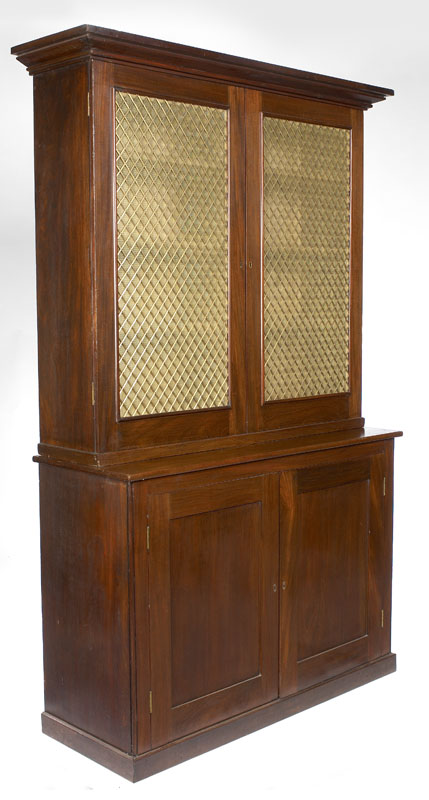 the projecting cornice above a pair of brass lozenge trellis and mesh fronted doors enclosing shelves, the undercabinet with two panelled doors, on plinth base, adapted