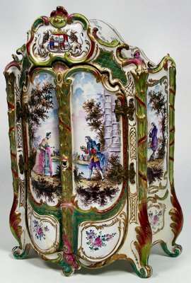 formed as a Louis XV armoire, the sides painted with romantic scenes depicting lovers in riverside landscapes, surmounted by an armorial cartouche and opening to reveal a shelved interior, raised on rococo scroll feet