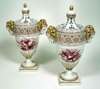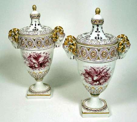 each with acorn finial above foliate pierced cover, the body with ram's head handles decorated in gilt and puce with a stylised flowerhead band, puce painted with a figural scene to one side and a trophy motif with birds to the other, above a band of stiff leaf decoration (2)