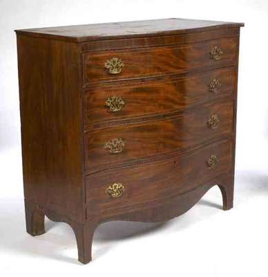 the inlaid frieze above four well-figured long graduated and cockbeaded drawers with pierced brass handles, on a shaped apron and bracket feet
