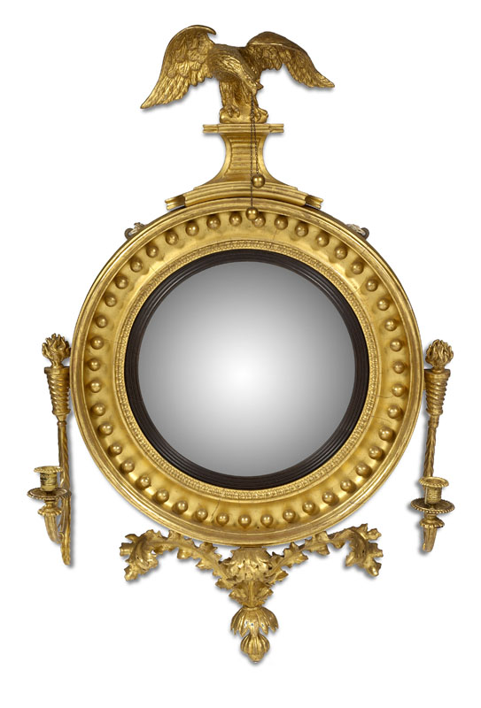 the circular mirror within a reeded slip and ball moulded frame, surmounted by an eagle crest and flanked by twin flaming torch scroll candle sconces