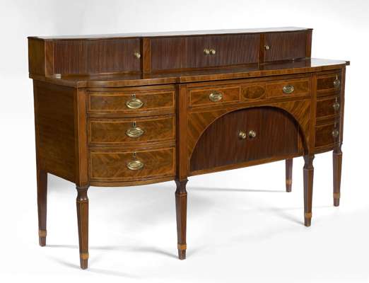 of break-bowfront form, the stage back with four tambour doors above a 'plum-pudding' figured top with three inlaid frieze drawers flanked by a deep cellarette drawer, panelled as two, and a cupboard door, with brass oval stamped handles, the arched recess with a pair of tambour doors, on partridgewood veneered uprights and square tapering legs with leaf-carved capitals and gaitered feet
