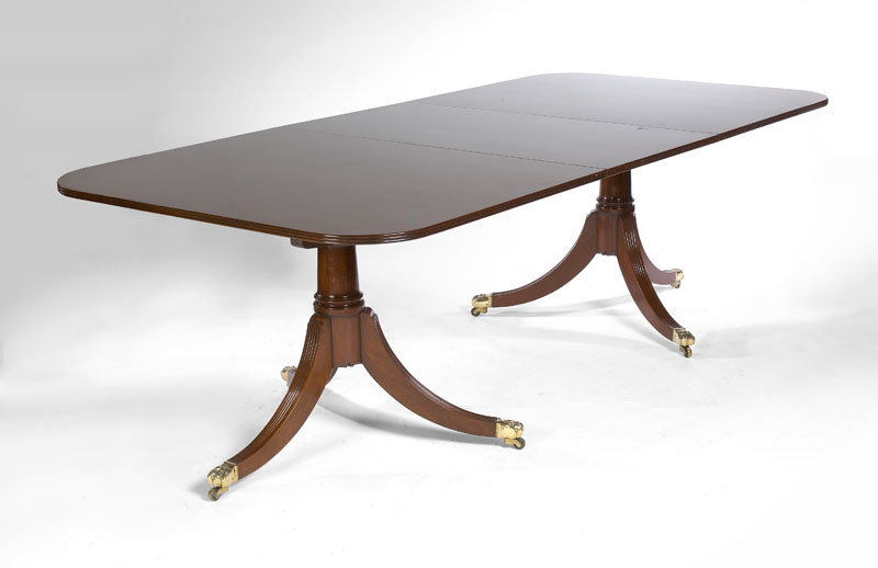 the rounded rectangular top with reeded edge and two additonal leaves above turned pillars on reeded downswept tripod bases with brass box castors