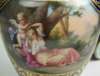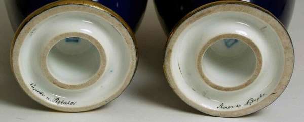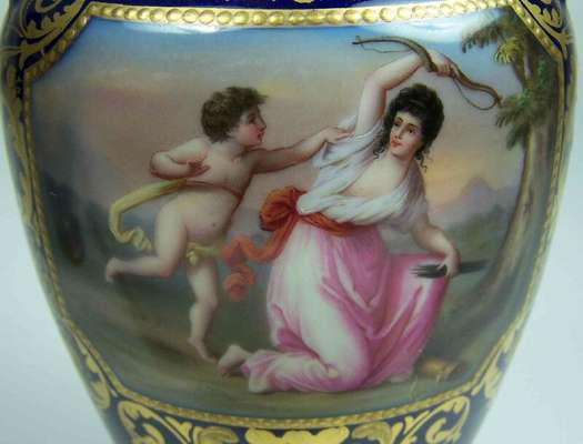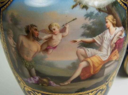 each of baluster form, decorated with gilt scrolling foliage on a dark blue ground, with opposed classical figure panels, 'Satyr u. Diana' opposing 'Cupido u. Aglaiou', the other with 'Diana' opposing 'Amor u. Nymph', signed Borg, underglaze blue beehive mark (2)