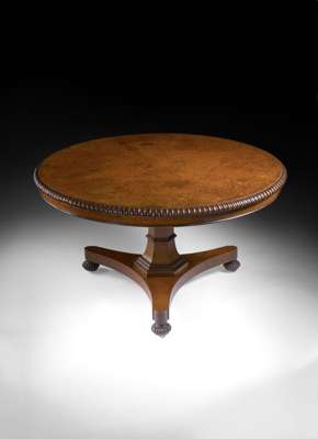 A late Regency period amboyna and rosewood circular tilt-top breakfast table By Gillows of Lancaster