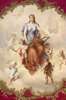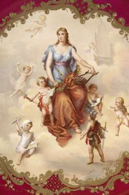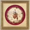 painted with a muse holding a lyre and wreath bounded by cherubs cavorting in clouds in allegory of the Arts, including literature, opera, music and the theatre, the crimson border with a raised inner band of gilt rocaille, signed lower right, the verso with three concentric foot rims and underglaze blue shield mark, flanked by impressed marks '69' and '2' and painted number '30', within a later gilt wood frame with velvet slip