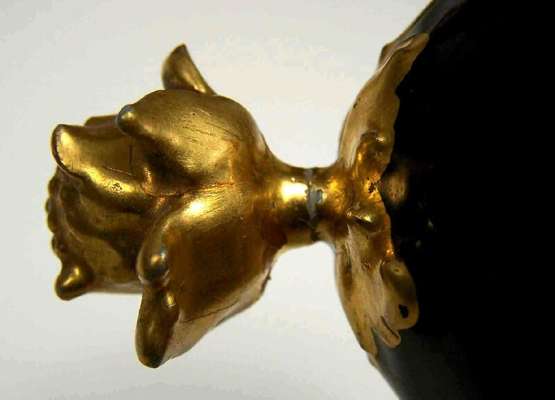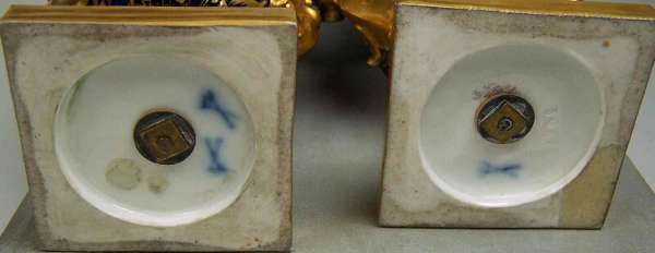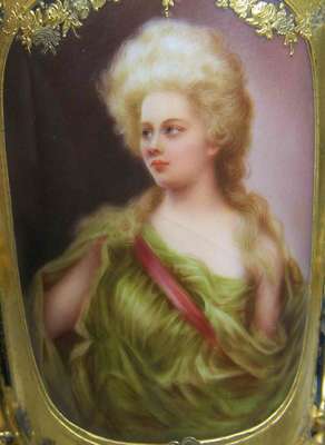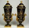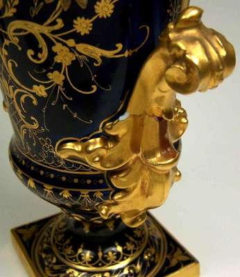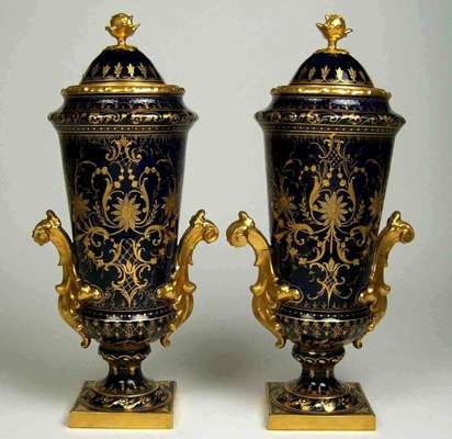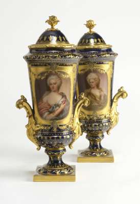 each with flowerhead finial above circular tapering body on turned column and square foot, decorated with gilt scrolling foliage on a dark blue ground, painted with a portrait of a lady, underglaze blue painted mark (2)