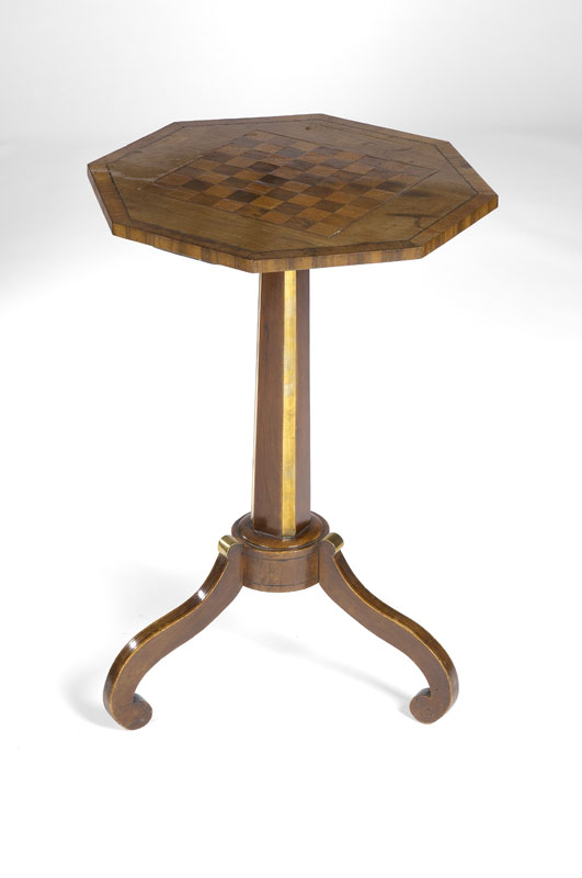 the octagonal top centered by a parquetry games board, raised on a brass mounted canted square column support, ending in a tripod base