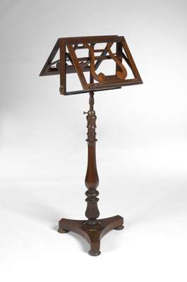the two lyre pierced music rests on ratchet supports, formerly with sconces ( the original ferrules remaining), on an adjustable faceted and lappet carved baluster column and triform platform base with disc feet